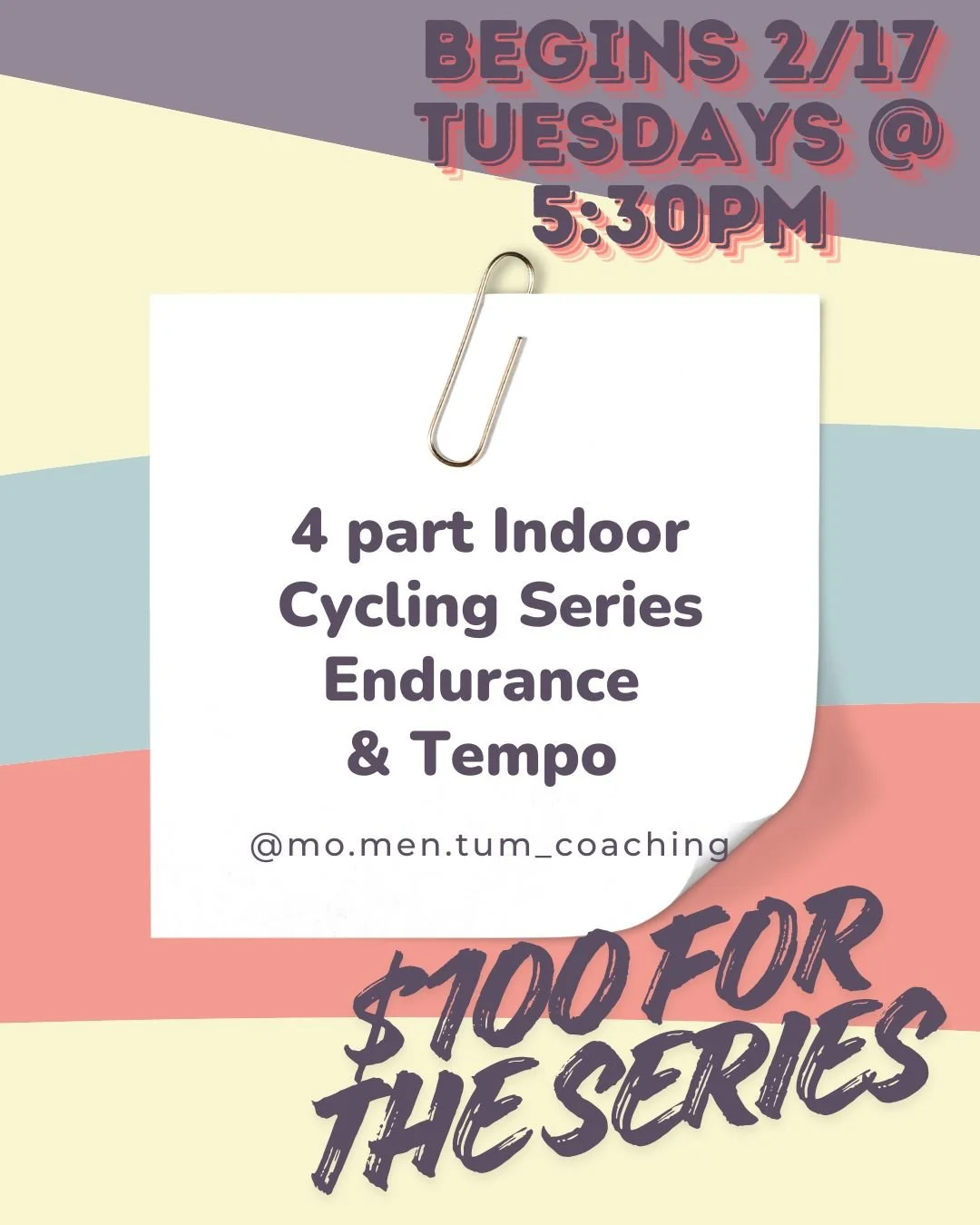 Join us for our next series of Indoor Classes! All 4 classes - $100. Bring your bike, towel and water and we provide the rest! Here is the link to sign up: https://square.link/u/kIxJ0BBr